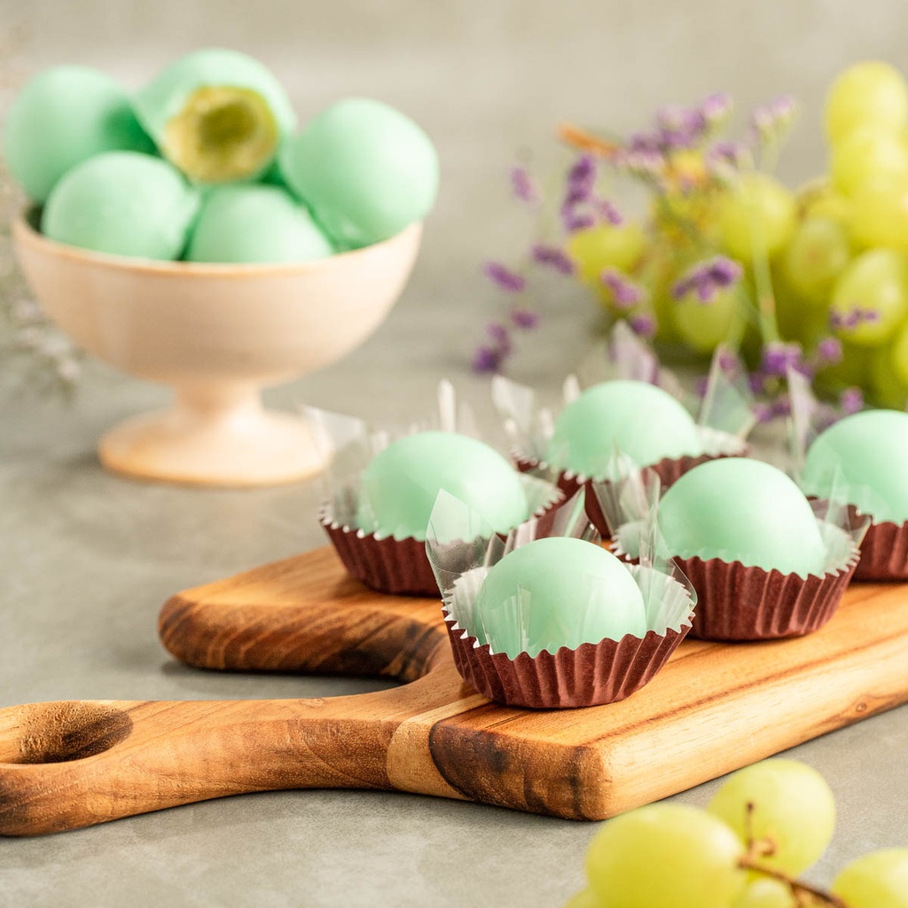 Bombom de Uva: Delicioso bombom com recheio de uva verde. Uma deliciosa combinação misturando o chocolate branco, o docinho do leite condensado com o suave azedinho da uva.